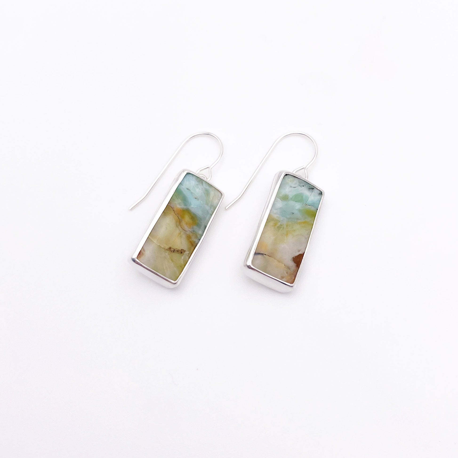 With a gradient of tans and blue-greens, these rectangular shaped Blue Opalized Petrified Wood dangle earrings will have you feeling like you're looking down on shallow beach waters. These natural gemstones come from Indonesia.