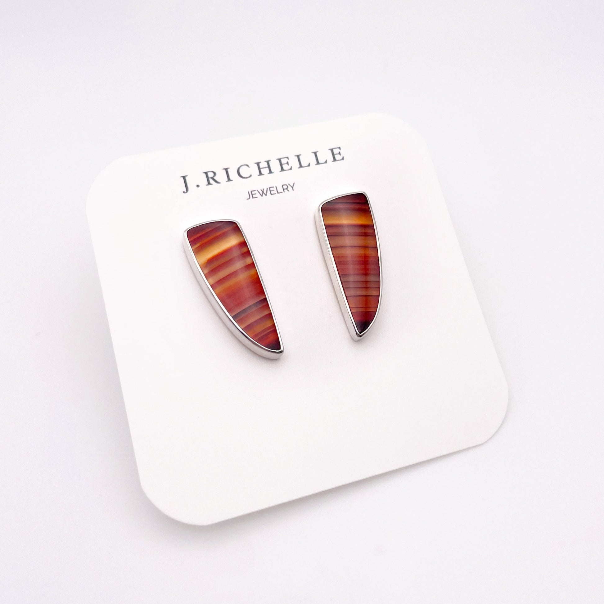 The natural vivid orange of these Indonesian Carnelian gemstone stud earrings will hang upon your ears to make a statement. These fang shaped gemstones are hand-set and finished with a post stud.