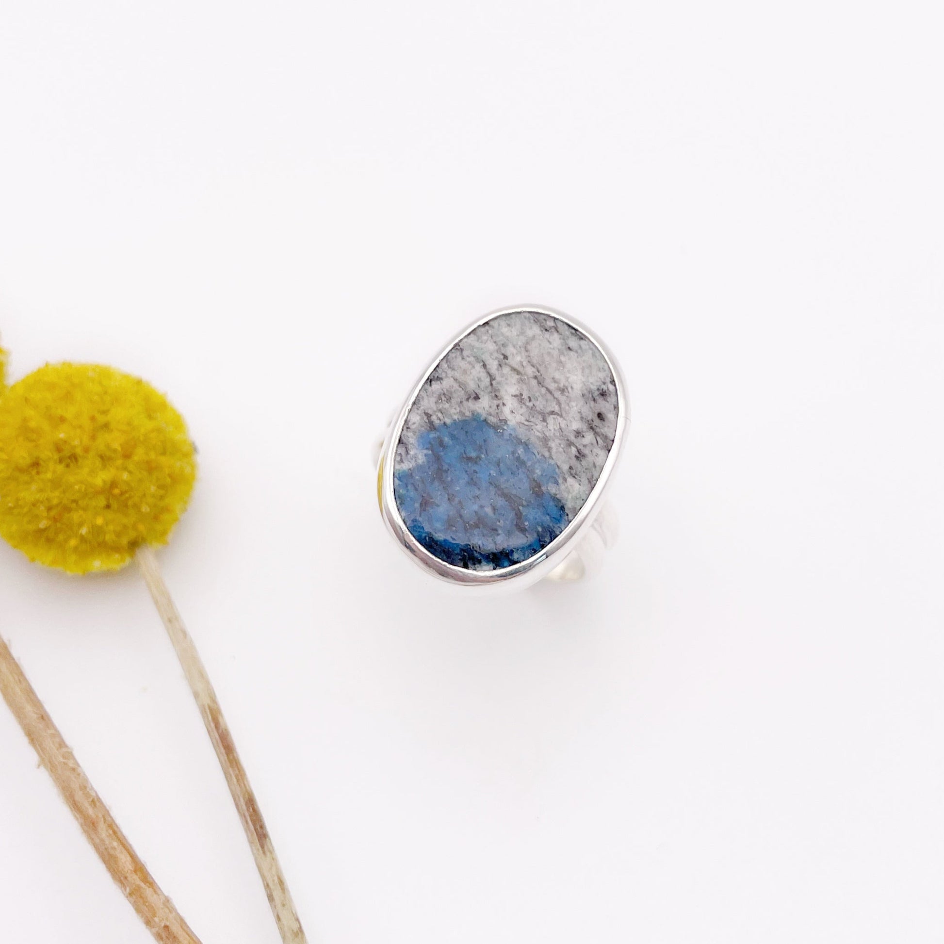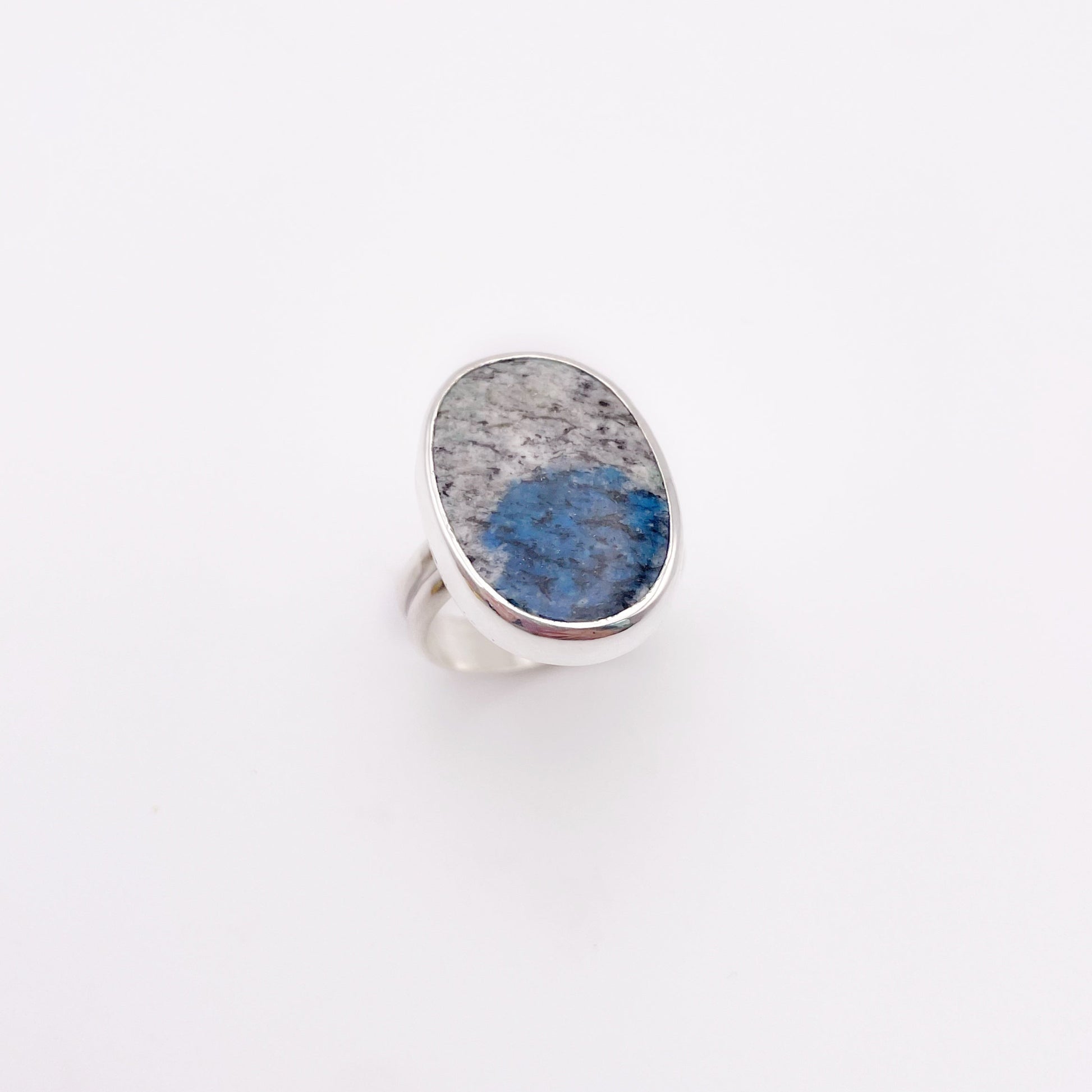 Recognize "K2" as the name of the world's second-highest mountain? Well, this stone comes from base camp in northern Pakistan. A bright white granite with a splatter of blue Azurite, this large oval shaped stone is so unique. Start a conversation with this statement ring and let the stone do all the talking.