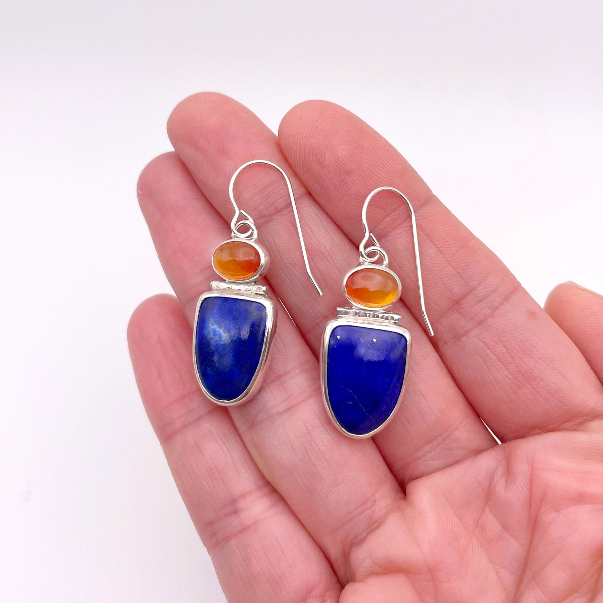 A killer combo! This vivid deep blue Lapis Lazuli and orange Carnelian earring is a complementary combo you need. These earrings will be sure to catch some attention!
