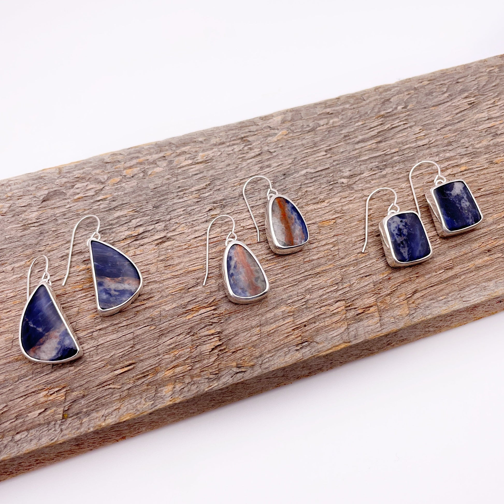 These deep, dark Sodalite gemstones will hang upon your ears to make a statement. These square shaped gemstones are hand-set and with a simple ear wire, these dangle earrings are easy to pop on as you finish styling your outfit.